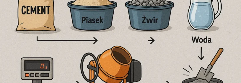 Ważnym krokiem jest dobór sprzętu: betoniarka 120–160 l do połowy kubatury, waga elektroniczna (dokładność 1 g), pojemnik do ręcznego mieszania, a w przypadku większych zleceń – pompa do betonu lub mieszarka mechaniczna :contentReference[oaicite:3]{index=3}.